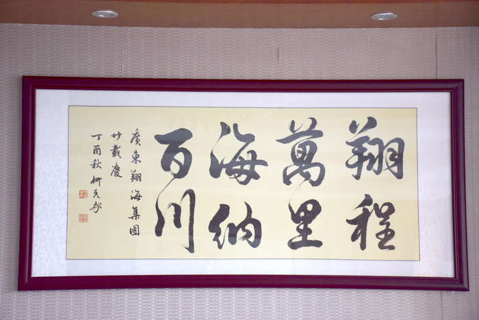 “翔程万里,海纳百川”,佛山市著名书法家亲自提笔,祝贺广东ly平台集团20周年庆典。