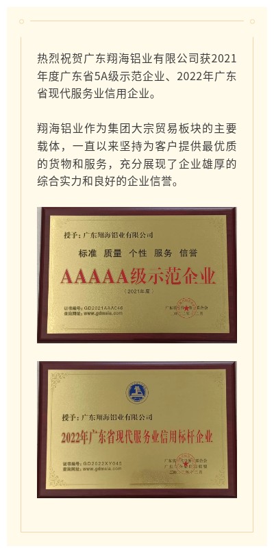 喜报 | ly平台铝业获评广东省5A级示范企业、现代服务业信用标杆企业